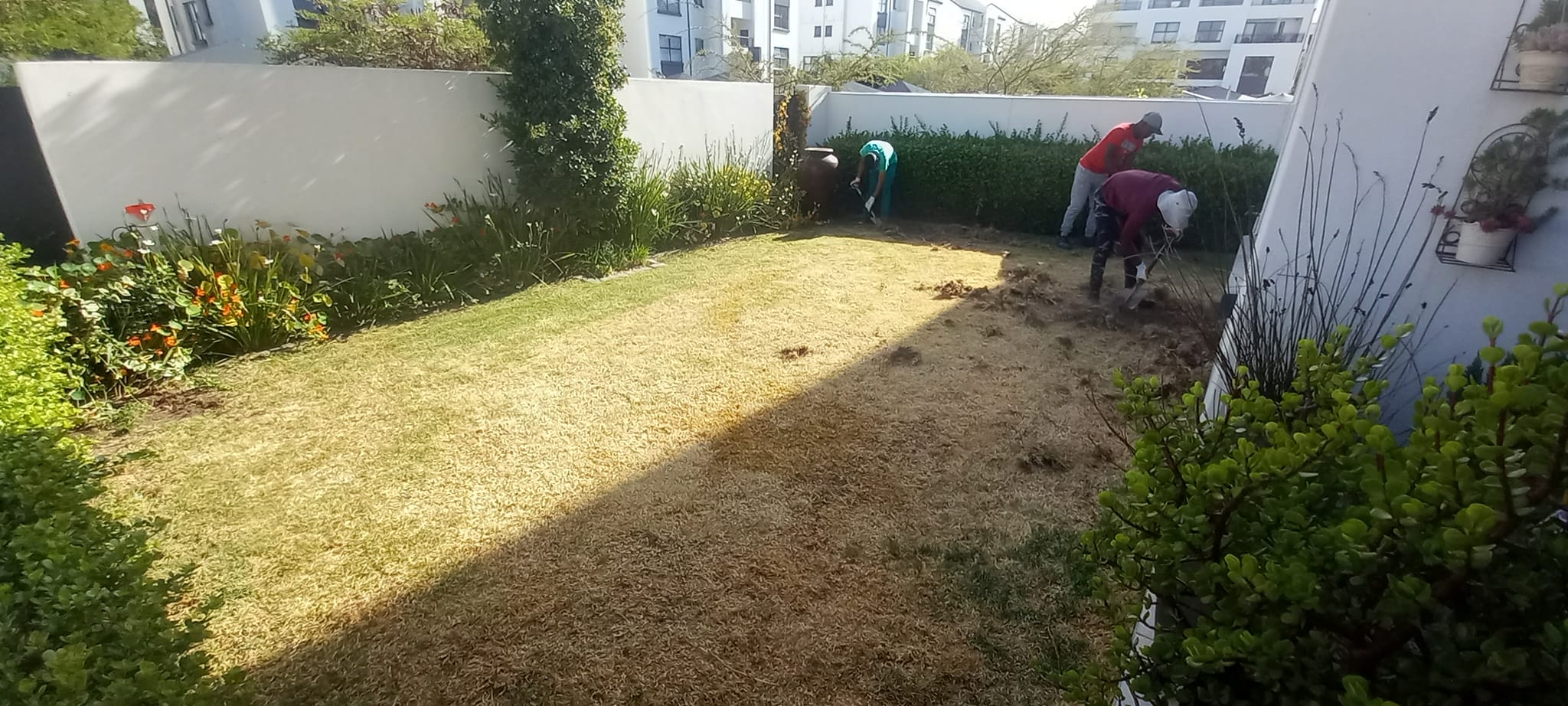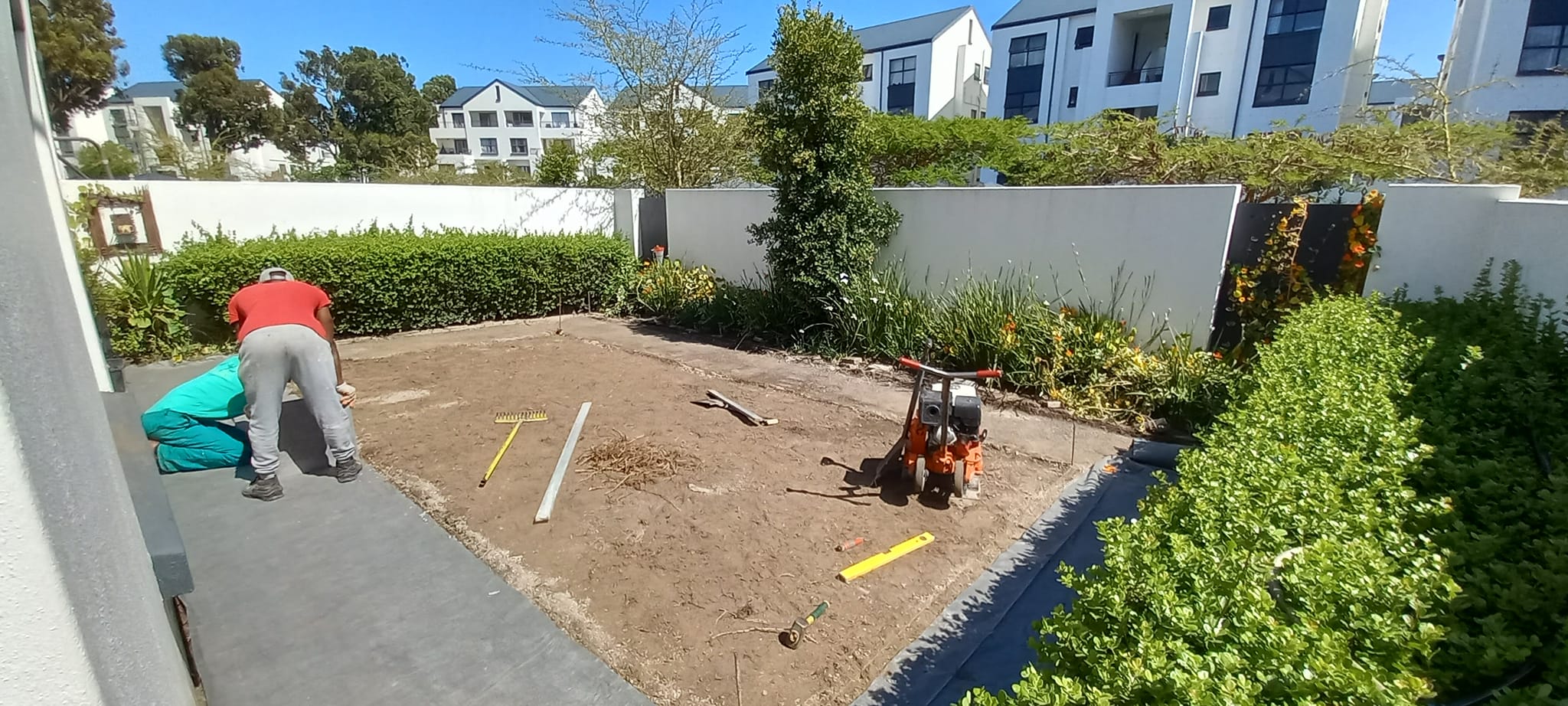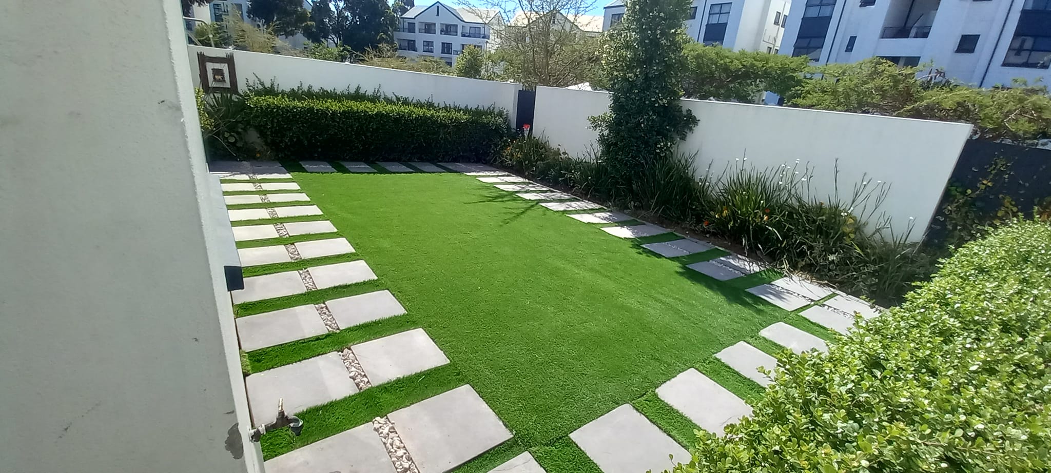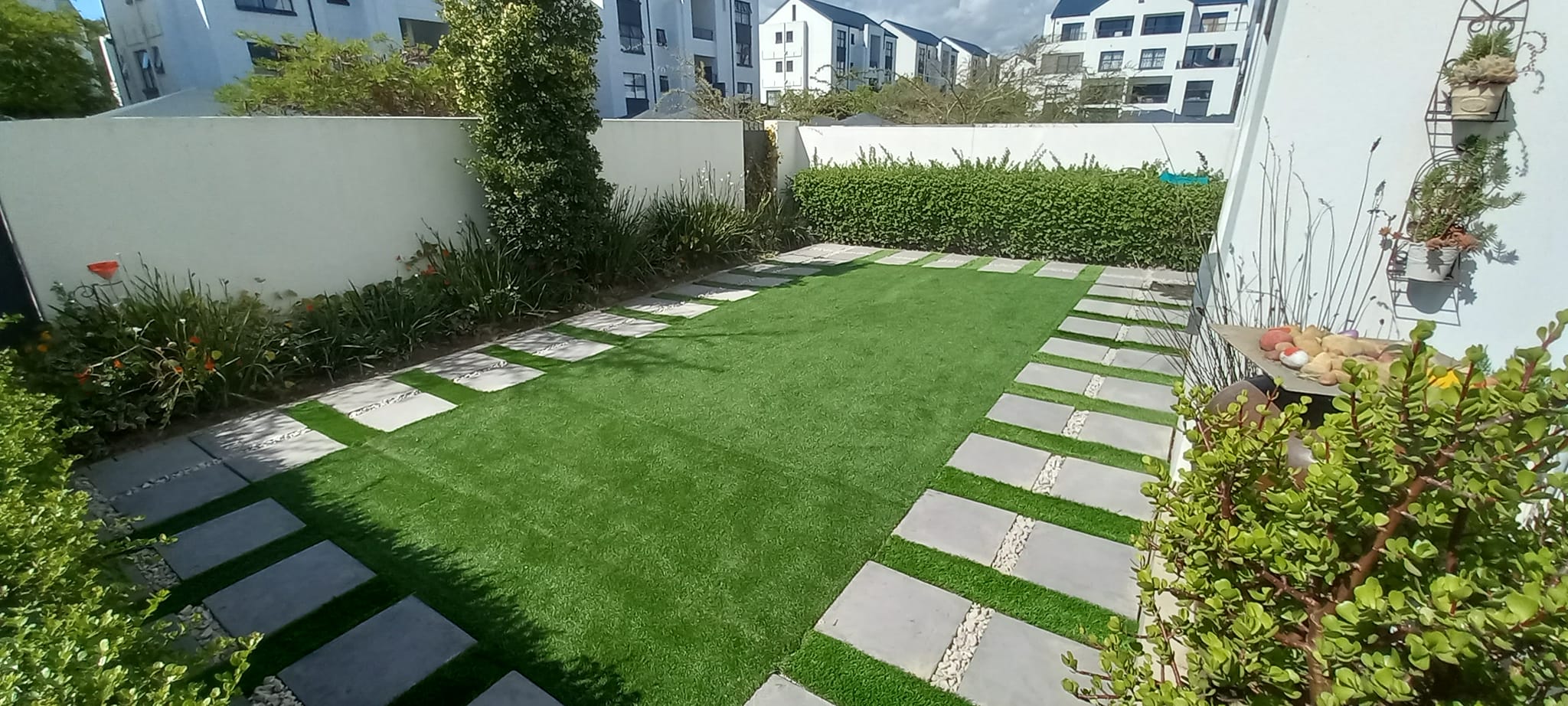 We successfully completed an artificial lawn installation at De Velde Estate, creating a low-maintenance and visually striking outdoor space. The project involved the removal of the existing lawn followed by thorough ground preparation and leveling to ensure a stable foundation. We then supplied and fitted premium 20mm artificial lawn, providing a lush, evergreen appearance with minimal upkeep. To enhance the design, we installed 450mm x 450mm charcoal paver blocks with elegant grey pebbles between them, creating a modern and sophisticated look. A charcoal cobblestone edging was added for a clean and structured finish. The result is a beautifully designed outdoor area that combines style, functionality, and durability.